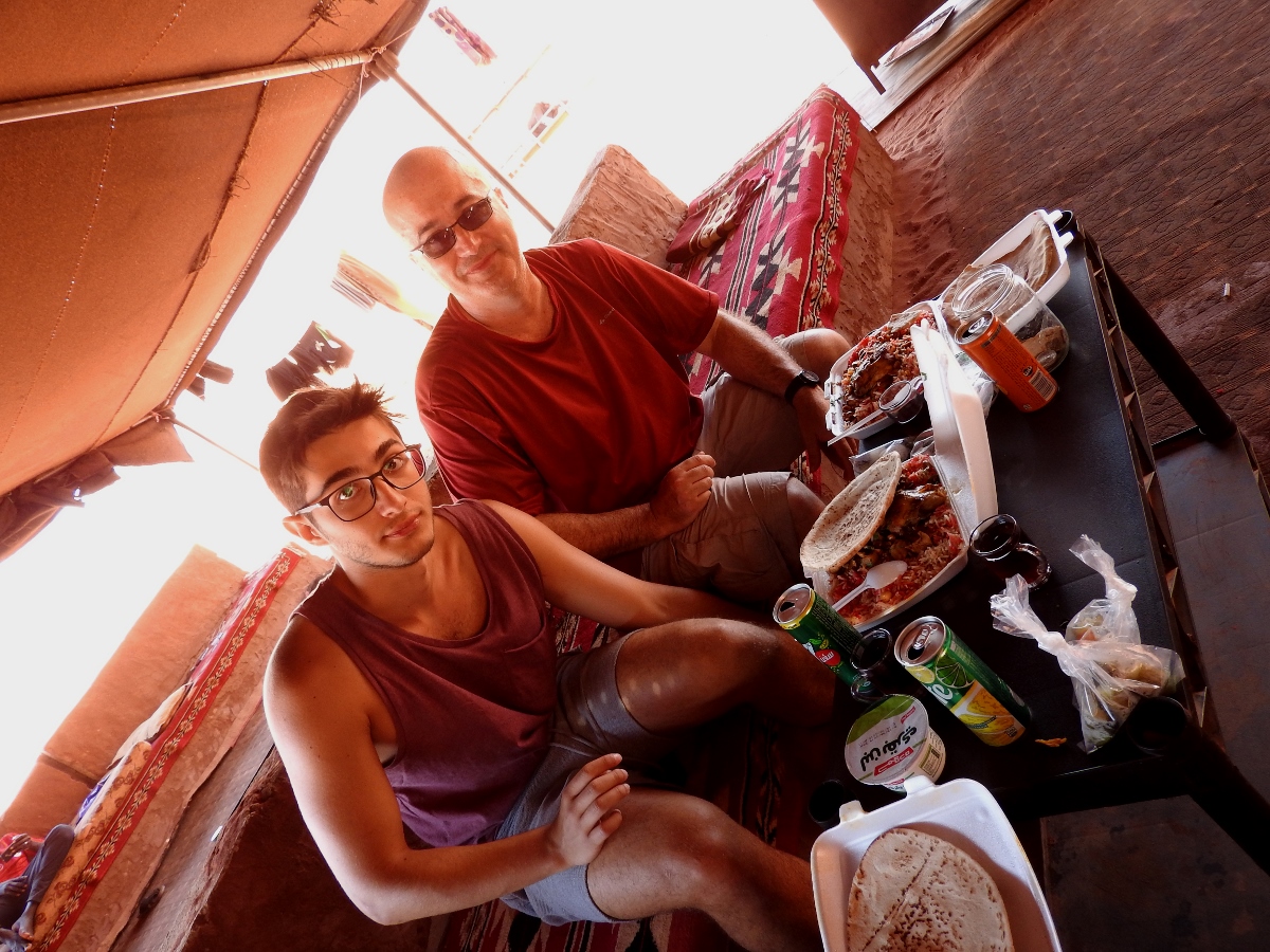 Mientras nosotros recorríamos el Cañón Khazali, Mutter se fue a buscar la comida y al salir nos llevó hasta una de las tiendas de beduinos y nos sirvió unas bandejas calientes con arroz, pollo y verduras como si existiera un delivery en el desierto. También podíamos elegir la bebida entre todo tipo de refrescos bien fresquitos. Nos sentó todo de maravilla!