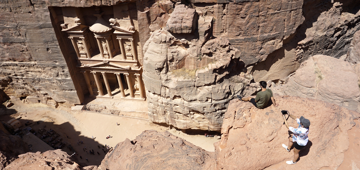 Se encuentra enfrente mismo, a media altura de la pared rocosa. Te lleva aproximadamente hasta la misma altura que tiene la fachada del Tesoro y se asciende por un terraplén rocoso que encontrarás al fondo de la plaza. De nuestra familia, sólo Raúl ascendió porque el día se presentaba intenso y los demás preferimos reservar fuerzas y evitar la posibilidad de una torcedura inoportuna. En las fotos podéis verle saludando en el mirador y la foto que nos tomó desde allí.