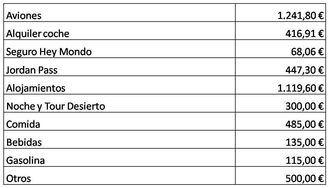 Wadi Rum, Ma'in Hot Springs, Madaba, Monte Nebo y Ammán, nos ha costado unos